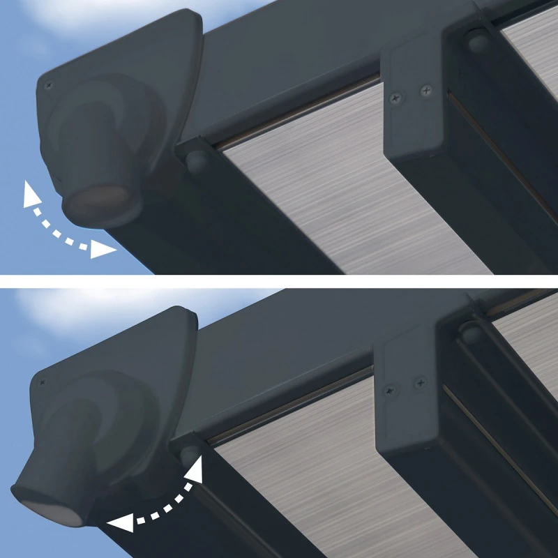 Robuste, l’auvent Feria possède une structure en aluminium revêtu de poudre pour une finition anti-rouille efficace. Les connecteurs en acier galvanisé découpé au laser et les repose-pieds inclus renforcent sa stabilité. La couverture de toit en polycarbonate à multi-parois de 8mm est également durable. Les panneaux sont solides, pratiquement incassables et protégés à 100% contre les rayons UV. Les gouttières intégrées évacuent les eaux pluviales en contribuant ainsi à l’étanchéité idéale de votre auvent Feria.