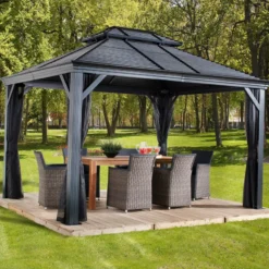Cette pergola est dotée d’une toiture solide constituée de tôles en acier galvanisé aux rayures horizontales, rappelant un agencement harmonieux d’ardoises de la même couleur que la structure. Ce produit de grande qualité vous est proposé par le spécialiste canadien des constructions de jardin, Sojag. Habitués des conditions climatiques sévères, tous leurs abris sont conçus pour résister durablement aux intempéries : neige, pluie ou soleil. La toiture peut soutenir une charge de neige impressionnante de 125kg/m² et le revêtement par thermolaquage ainsi que la toiture galvanisée ne craignent aucunement la corrosion.